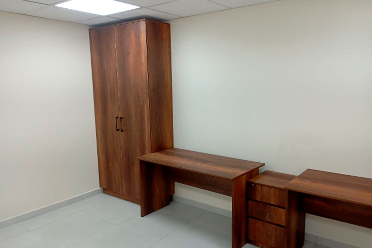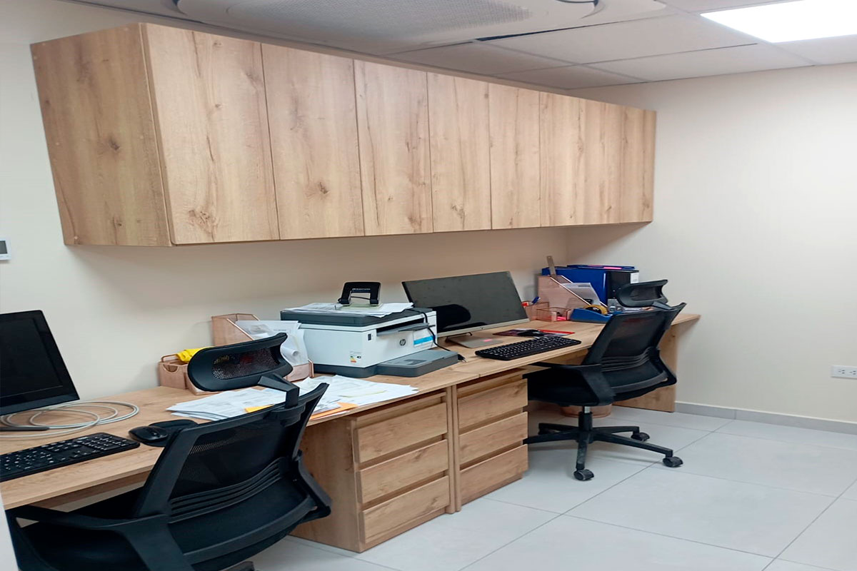 Descripción: Mobiliario de oficina compuesto por escritorios, credenzas, archivadores y muebles de almacenamiento.