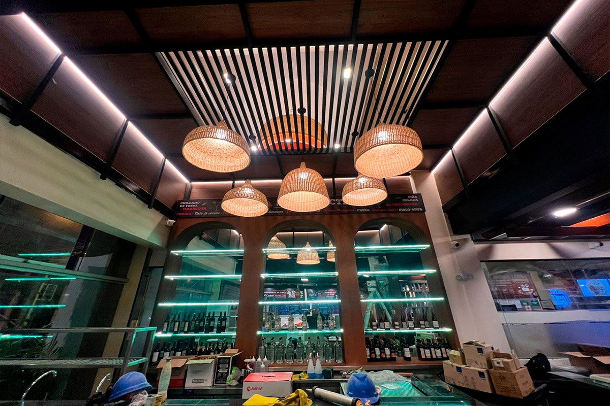 Descripción: Instalación de celosía decorativa en melamina amaderada, tipo techo, con montaje completo y adecuación de transbarra.
