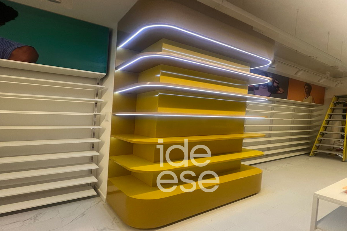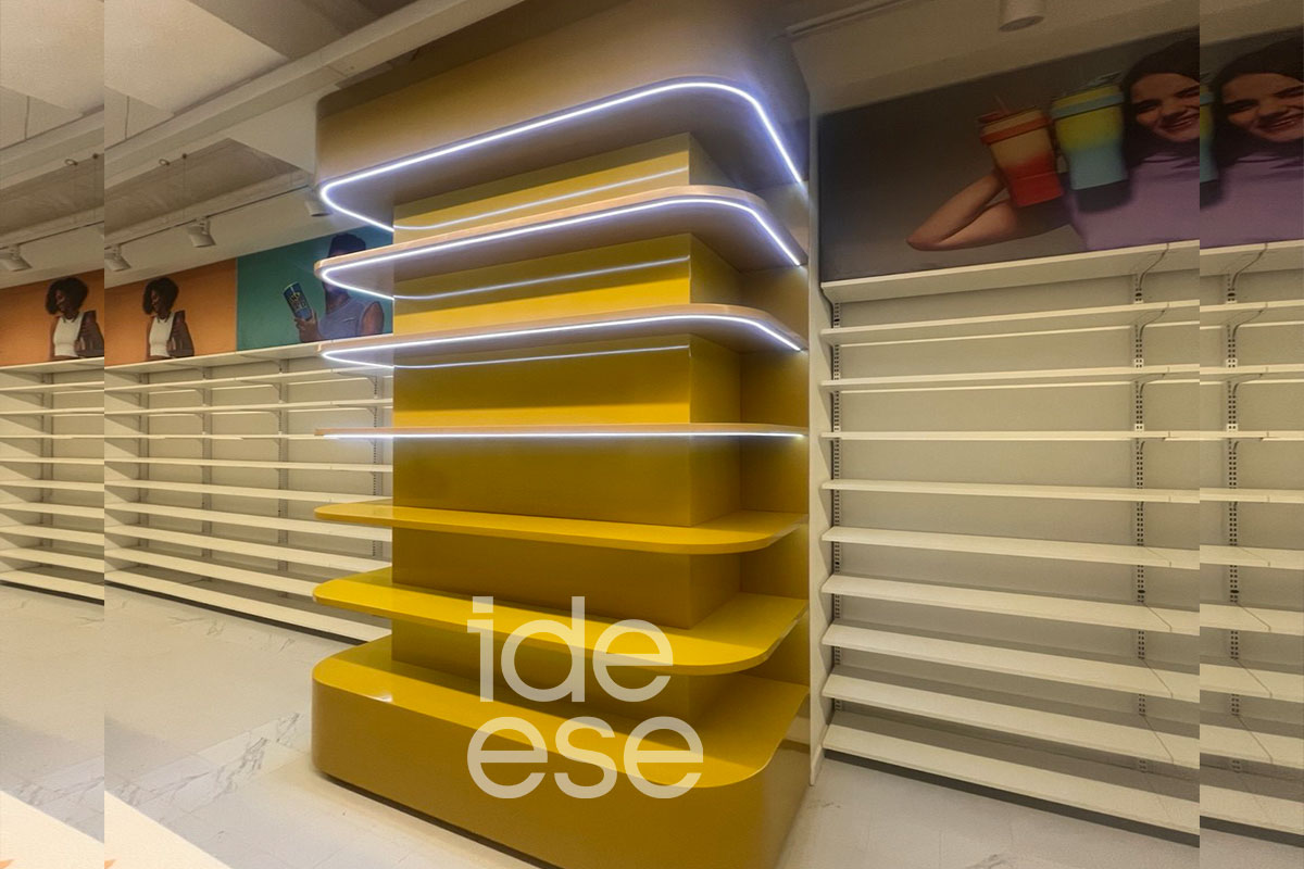 Descripción: Mobiliario tipo torre para exhibición vertical, con diseño compacto y acabado personalizado.